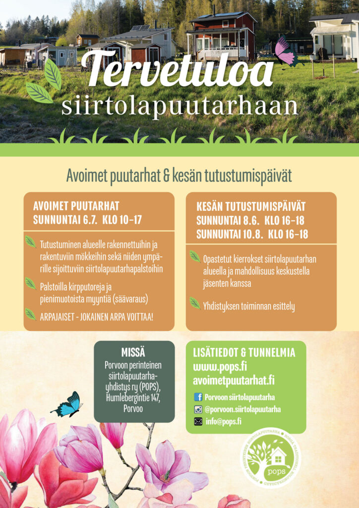Poimi POPSin infopisteeltä kartta, josta näet avoimet palstat ja mökit ja eri tapahtumapisteet. Palstojen edestä löytyy lisätietoa avoinna olevista mökeistä ja palstoista.